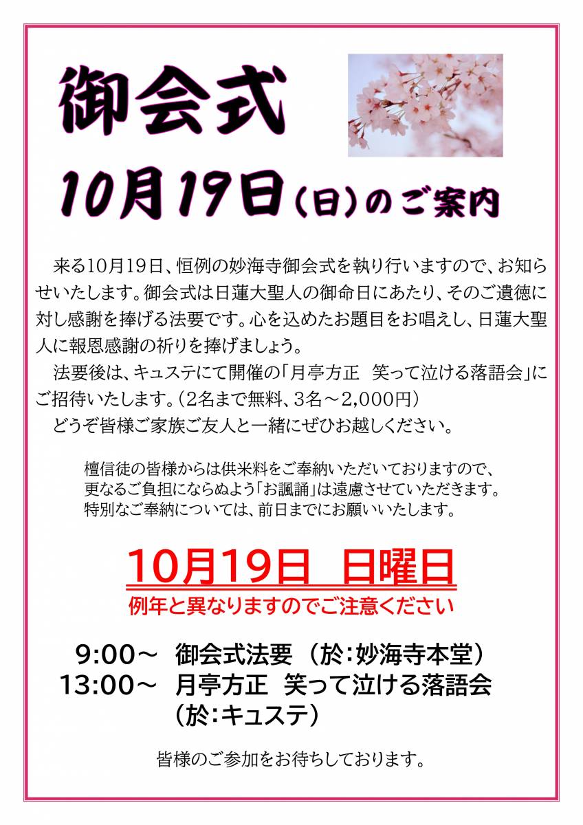 来る10月19日(日)、毎年恒例の妙海寺御会式を執り行います